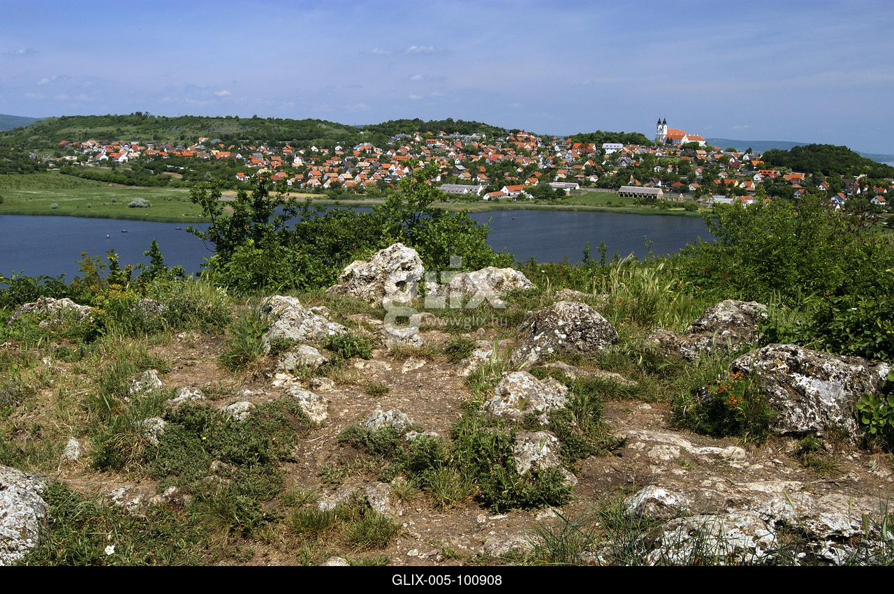 A Tihanyi Gejzírmező, vagy Aranyház, háttérben a Belső-tó és Tihany település látványa.