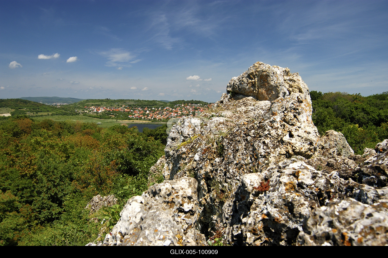 Tihanyi panoráma a Nyereg-hegyről. A Nyereg-hegy a Csúcs-hegyet az Apáti-heggyel összekötő keskeny, sziklás gerinc, melyről csodálatos panoráma nyílik a Balaton-felvidék, a Balaton déli medencéje és a Bozsai-öböl felé, ellenkező irányban pedig a félsziget belsejére.