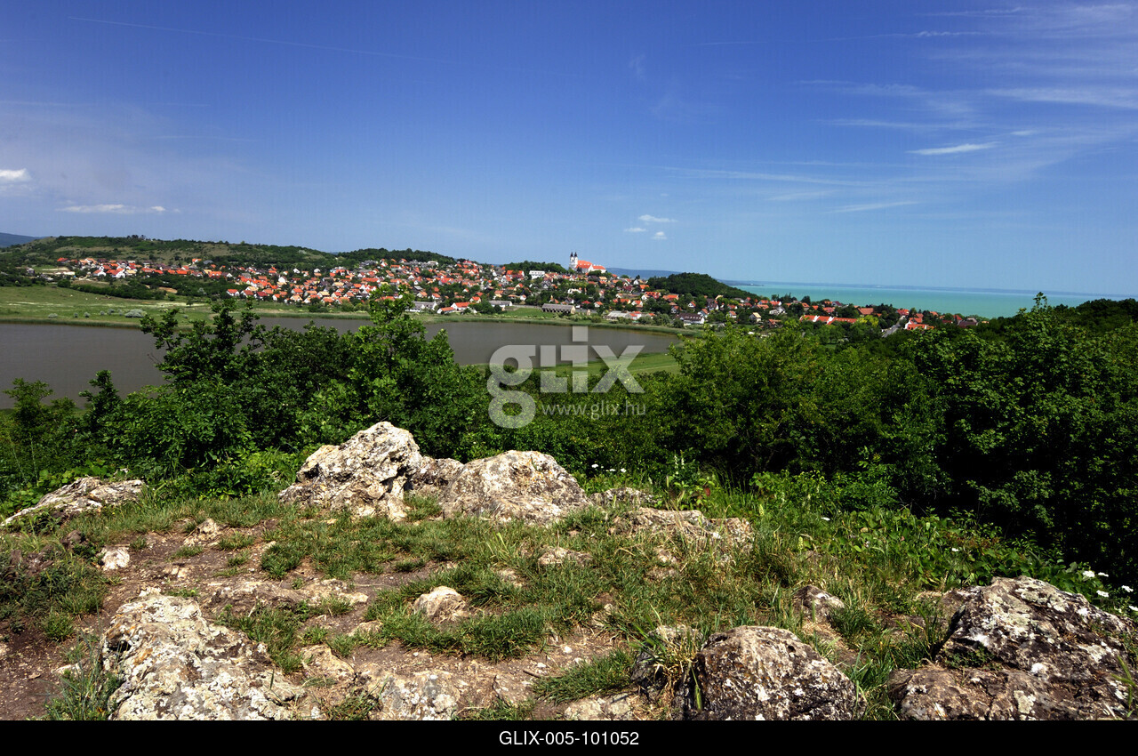 Tihanyi panoráma a Belső-tóval, előtérben a Szélmarta sziklák.