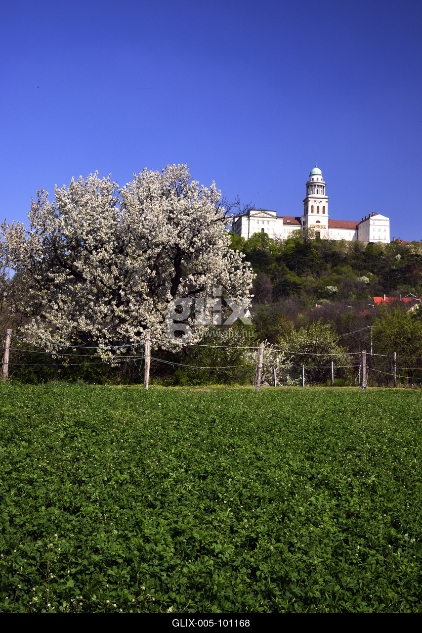 Pannonhalma és a Szent Márton-hegyen álló Pannonhalmi Bencés Főapátság látképe.