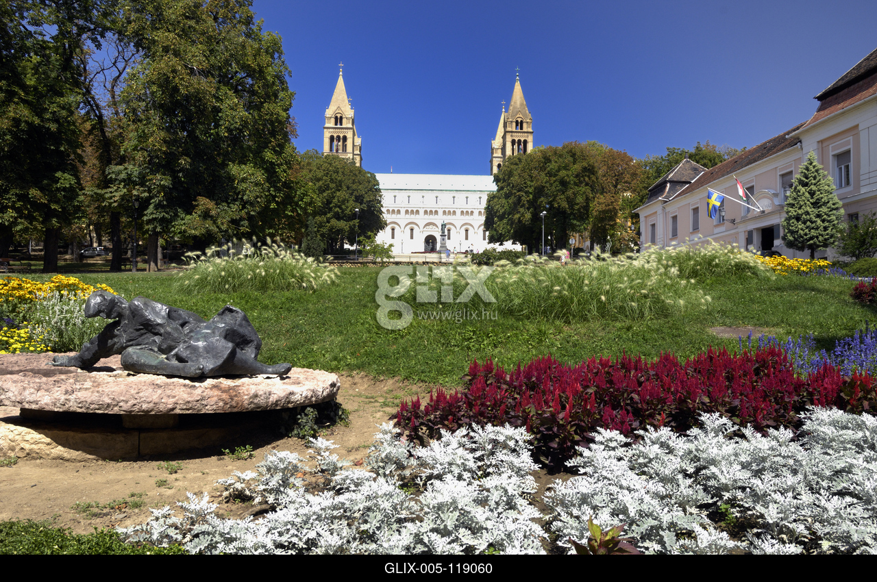 A Szent István téren (Séta tér) parkjában látható Vígh Tamás: Régészet című szobra. Háttérben a Szent Péter- és Szent Pál-székesegyház neoromán épülete.