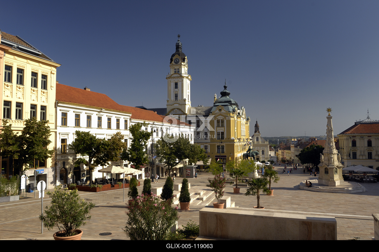 A neobarokk, eklektikus Városháza a Széchenyi téren. Jobbra a Szentháromság-szobor.