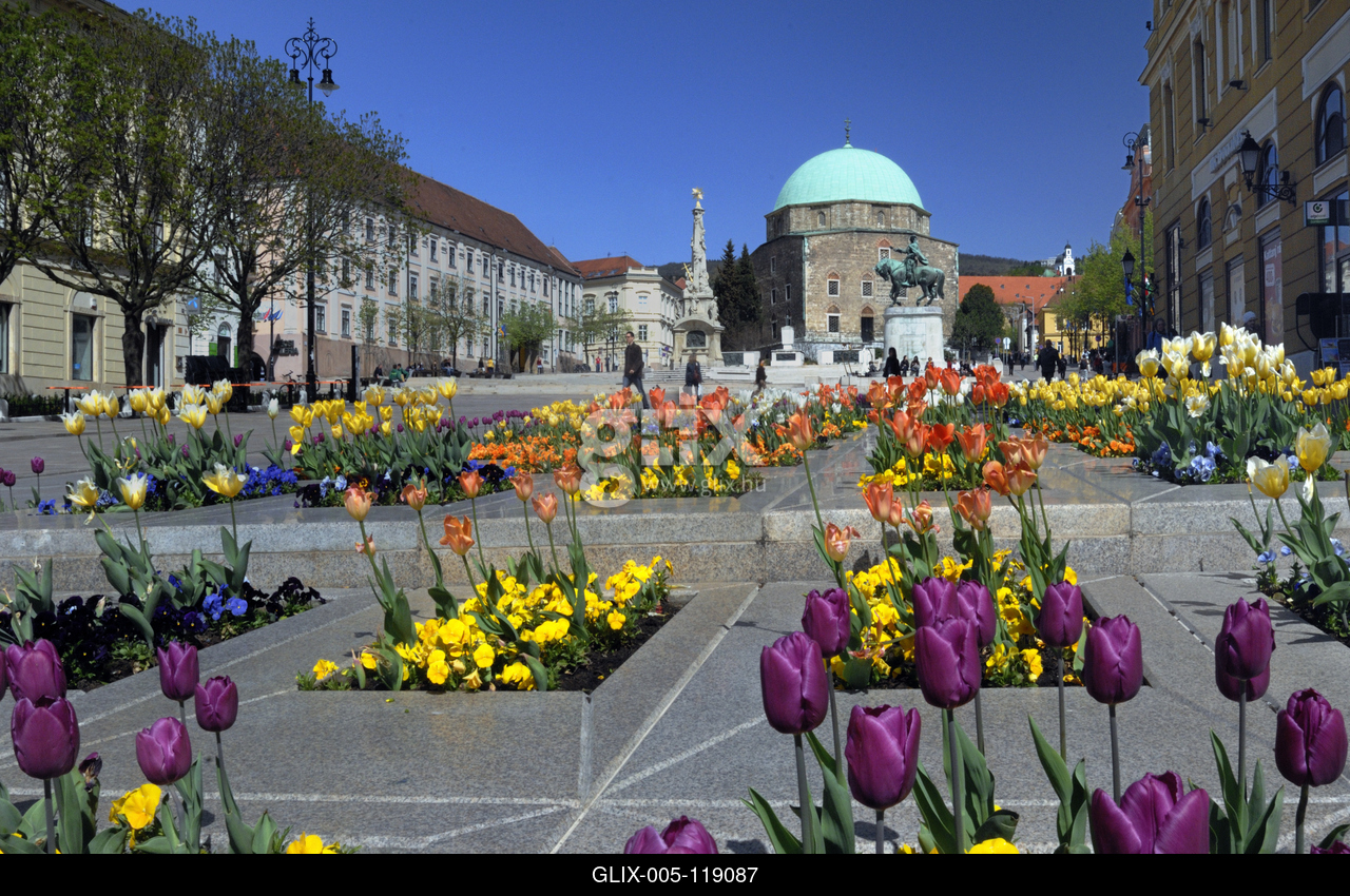 A Széchenyi téren áll Gázi Kászim pasa dzsámija (Belvárosi Gyertyaszentelő Boldogasszony-templom) a magyarországi török-iszlám építészet legmonumentálisabb alkotása. Ma katolikus templomként működik. Előtte balra a Szentháromság-szobor, jobbra Hunyadi János lovasszobra.