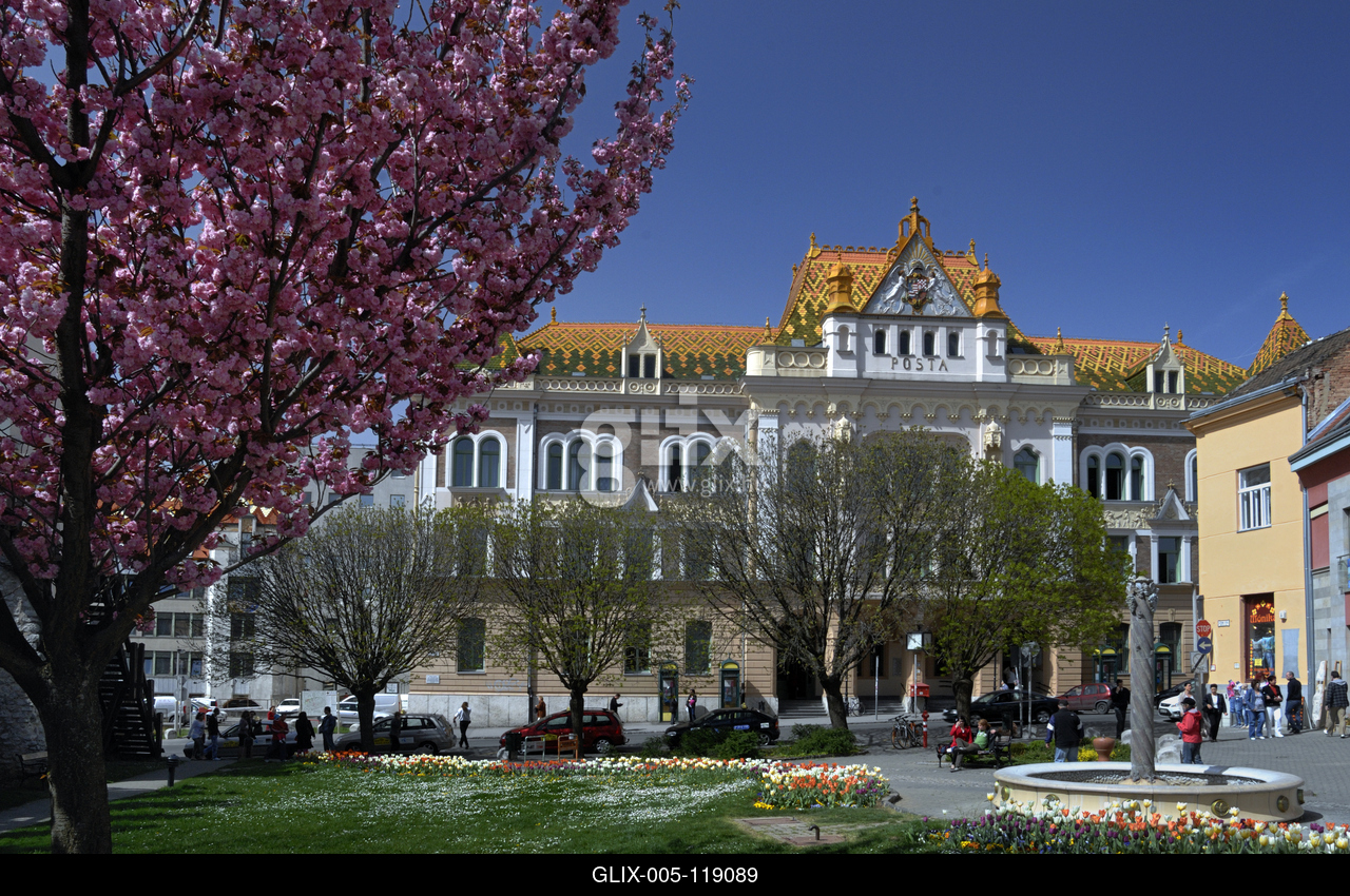 A Zsolnay kerámiákkal díszített pécsi Postapalota eklektikus homlokzata.