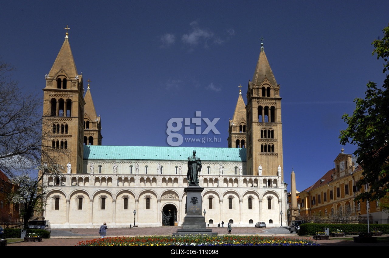 A Szent Péter- és Szent Pál-székesegyház neoromán épülete. Előtte Szepessy Ignác bronzszobra.