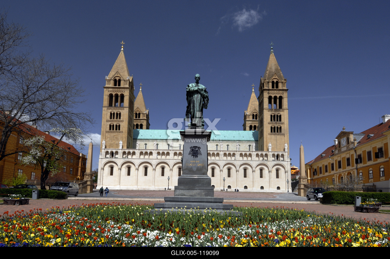 Szepessy Ignác bronzszobra a Szent Péter- és Szent Pál-székesegyház neoromán épülete előtt.