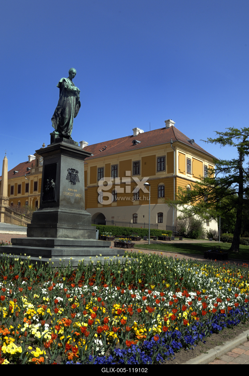 Szepessy Ignác bronzszobra a Szent Péter- és Szent Pál-székesegyház neoromán épülete előtt. Háttérben a Káptalani Levéltár és Plébánia késő barokk épülete.