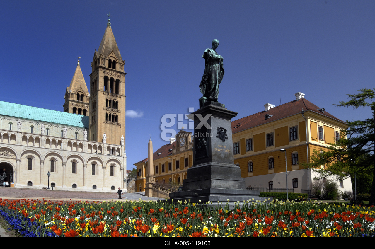 Szepessy Ignác bronzszobra a Szent Péter- és Szent Pál-székesegyház neoromán épülete előtt. Háttérben a Káptalani Levéltár és Plébánia késő barokk épülete.