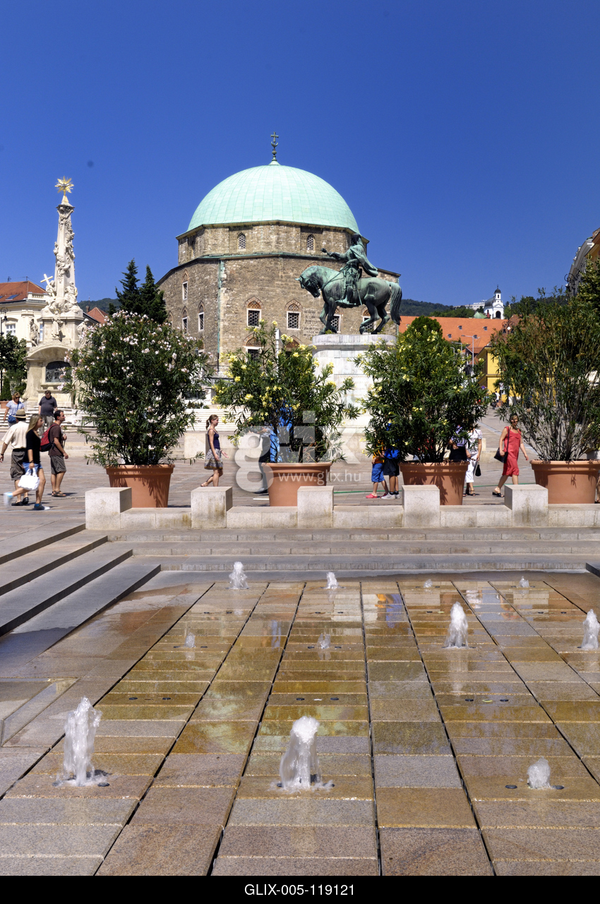 A Széchenyi téren áll Gázi Kászim pasa dzsámija (Belvárosi Gyertyaszentelő Boldogasszony-templom) a magyarországi török-iszlám építészet legmonumentálisabb alkotása. Ma katolikus templomként működik. Előtte balra a Szentháromság-szobor, jobbra Hunyadi János lovasszobra.