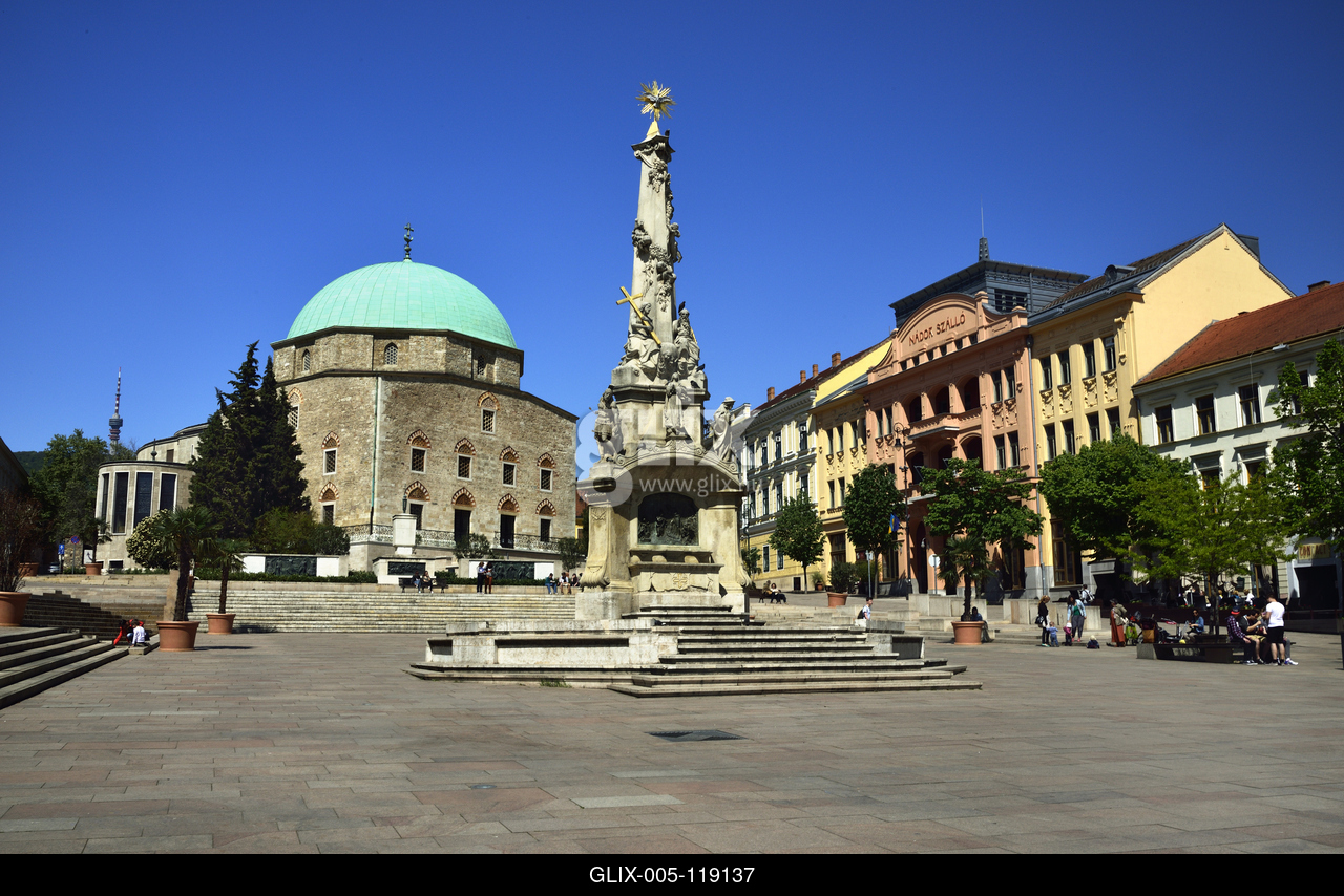 A Széchenyi téren áll Gázi Kászim pasa dzsámija (Belvárosi Gyertyaszentelő Boldogasszony-templom) a magyarországi török-iszlám építészet legmonumentálisabb alkotása. Ma katolikus templomként működik. Jobbra a szecessziós stílusú Nádor Szálló. Középen a Szentháromság-szobor.