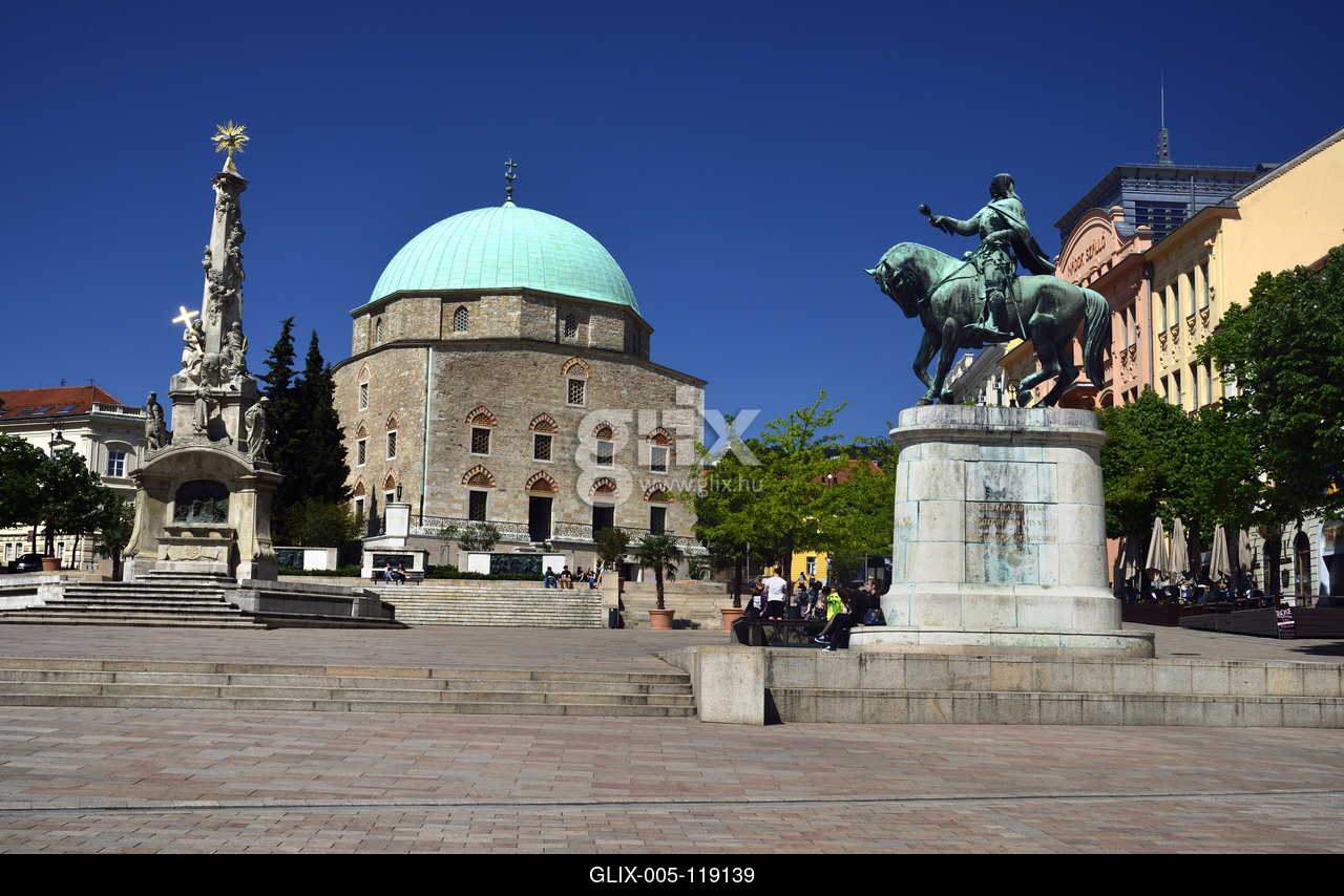 A Széchenyi téren áll Gázi Kászim pasa dzsámija (Belvárosi Gyertyaszentelő Boldogasszony-templom) a magyarországi török-iszlám építészet legmonumentálisabb alkotása. Ma katolikus templomként működik. Előtte balra a Szentháromság-szobor, jobbra Hunyadi János lovasszobra.