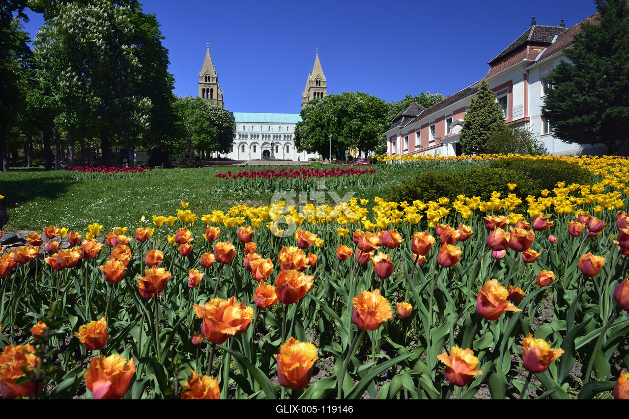 A Szent István tér (Séta tér) tulipánjai. Háttérben a Szent Péter- és Szent Pál-székesegyház neoromán épülete.
