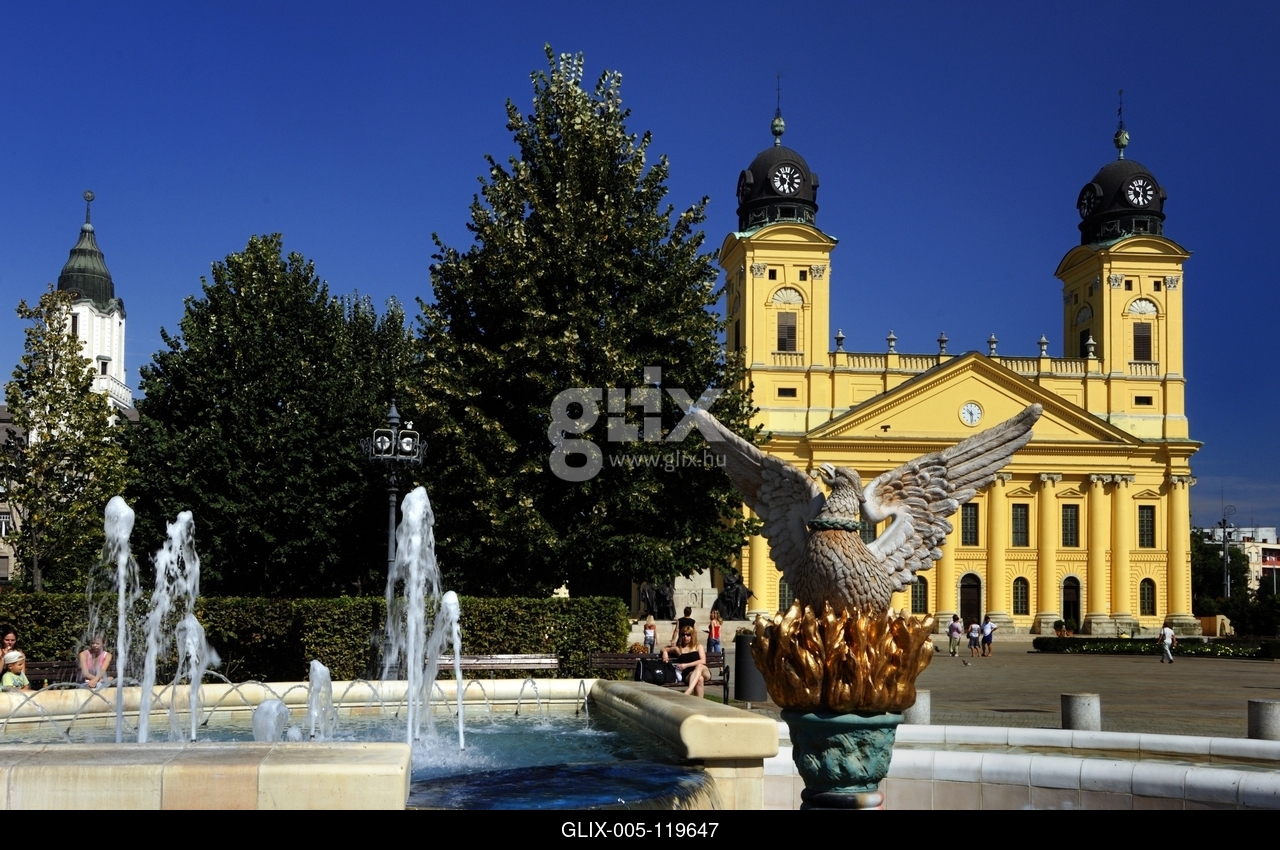Debrecen, a Millenniumi szökőkút és a Református Nagytemplom