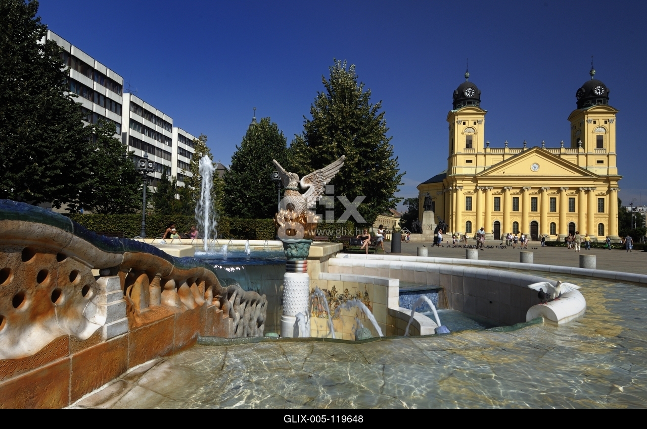 Debrecen, a Millenniumi szökőkút és a Református Nagytemplom a Kossuth téren.