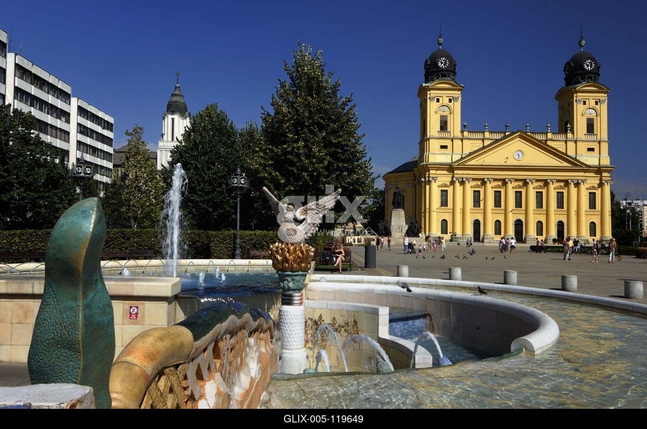 Debrecen, a Millenniumi szökőkút és a Református Nagytemplom