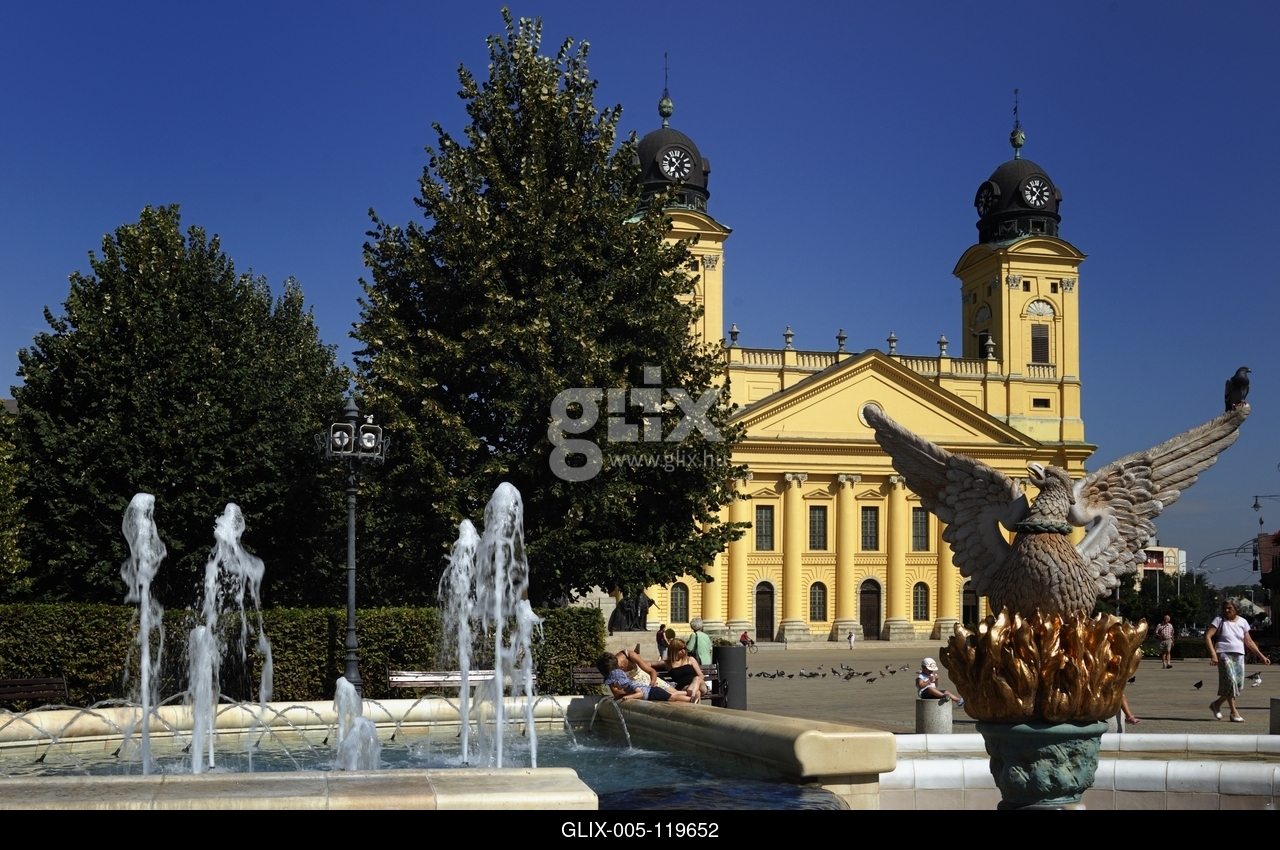 Debrecen, a Millenniumi szökőkút és a Református Nagytemplom