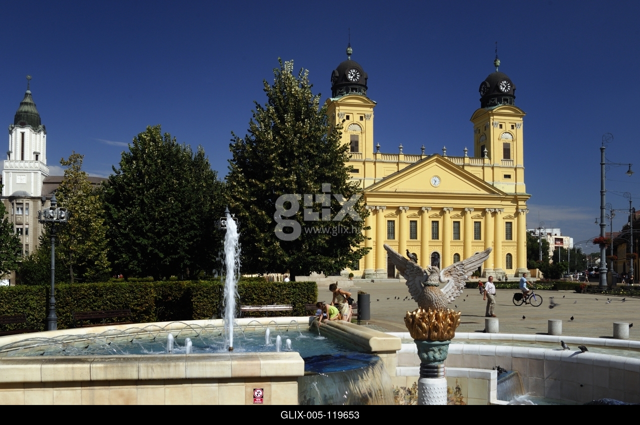 Debrecen, a Millenniumi szökőkút és a Református Nagytemplom a Kossuth téren.