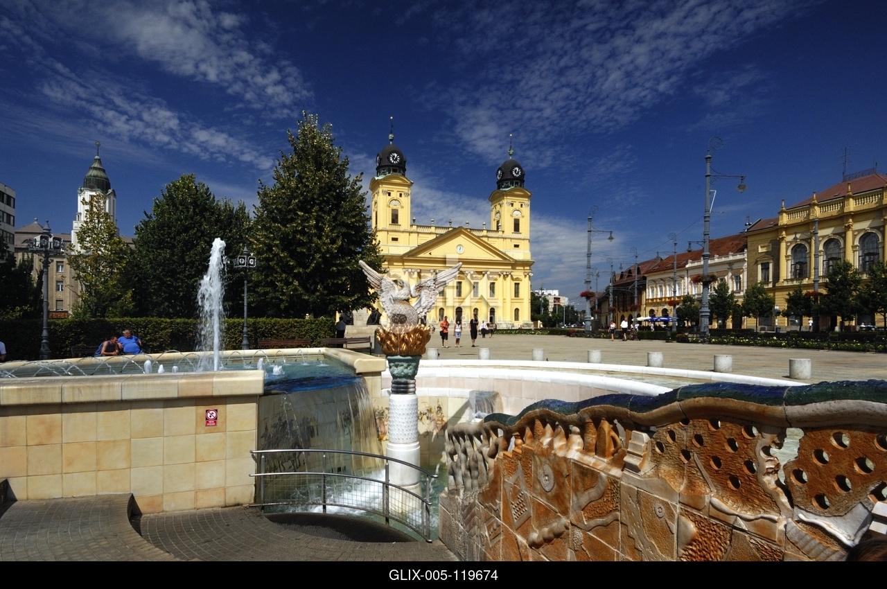 Debrecen, a Millenniumi szökőkút és a Református Nagytemplom
