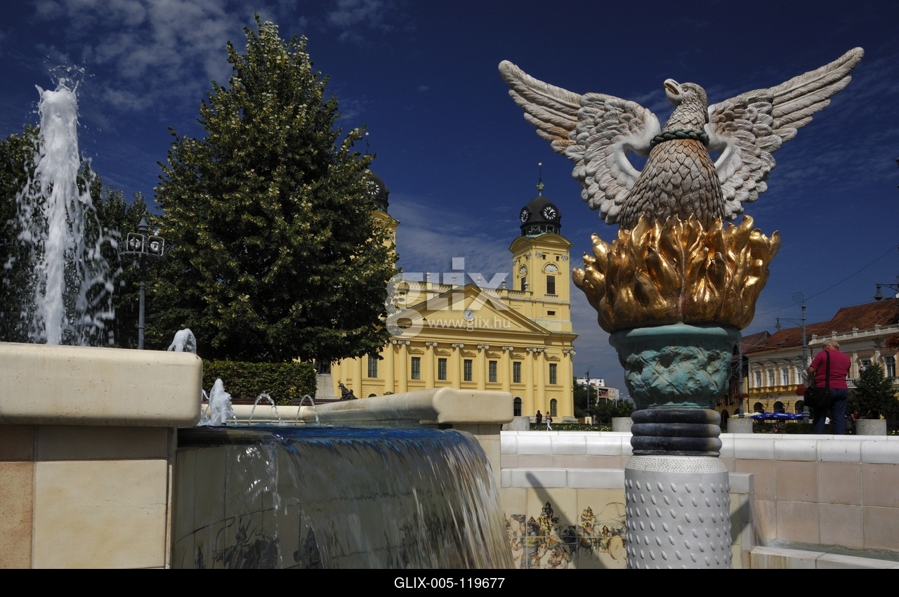 Debrecen, a Millenniumi szökőkút és a Református Nagytemplom