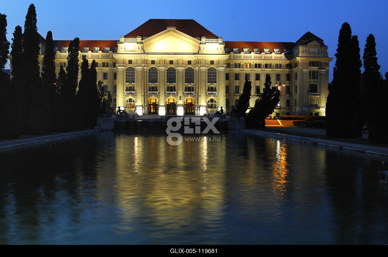 A Debreceni Egyetem főépülete esti díszkivilágításban.