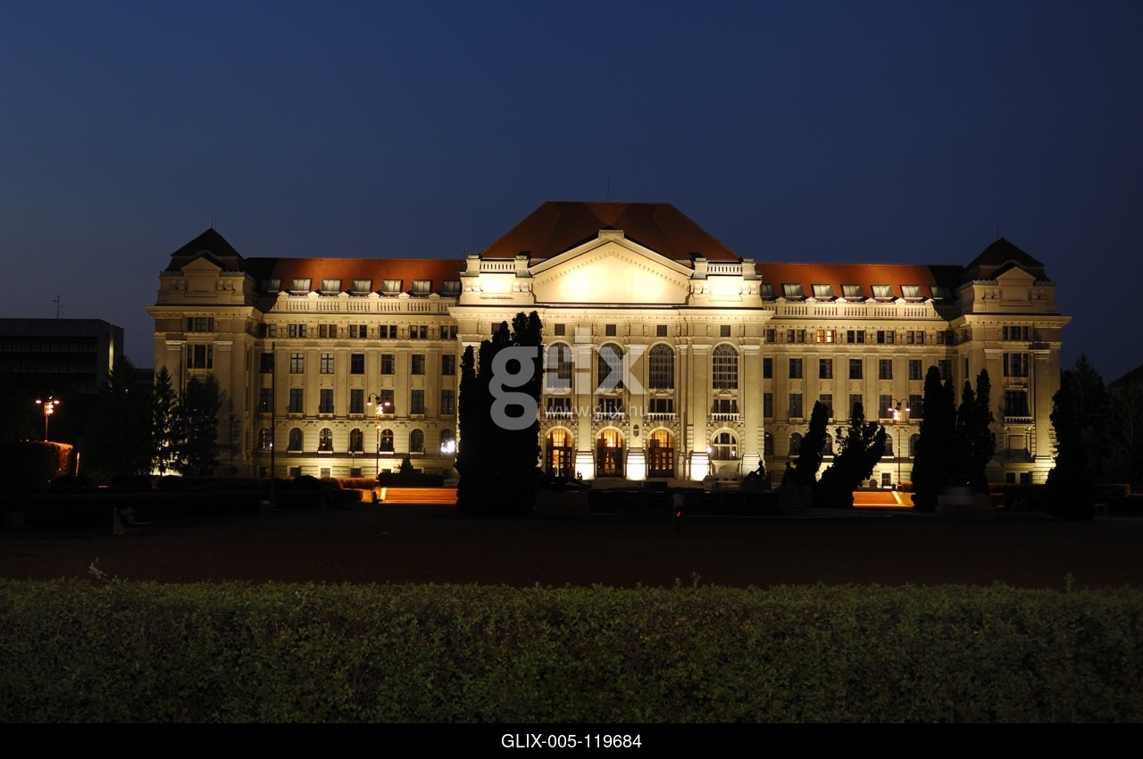 A Debreceni Egyetem főépülete esti díszkivilágításban.