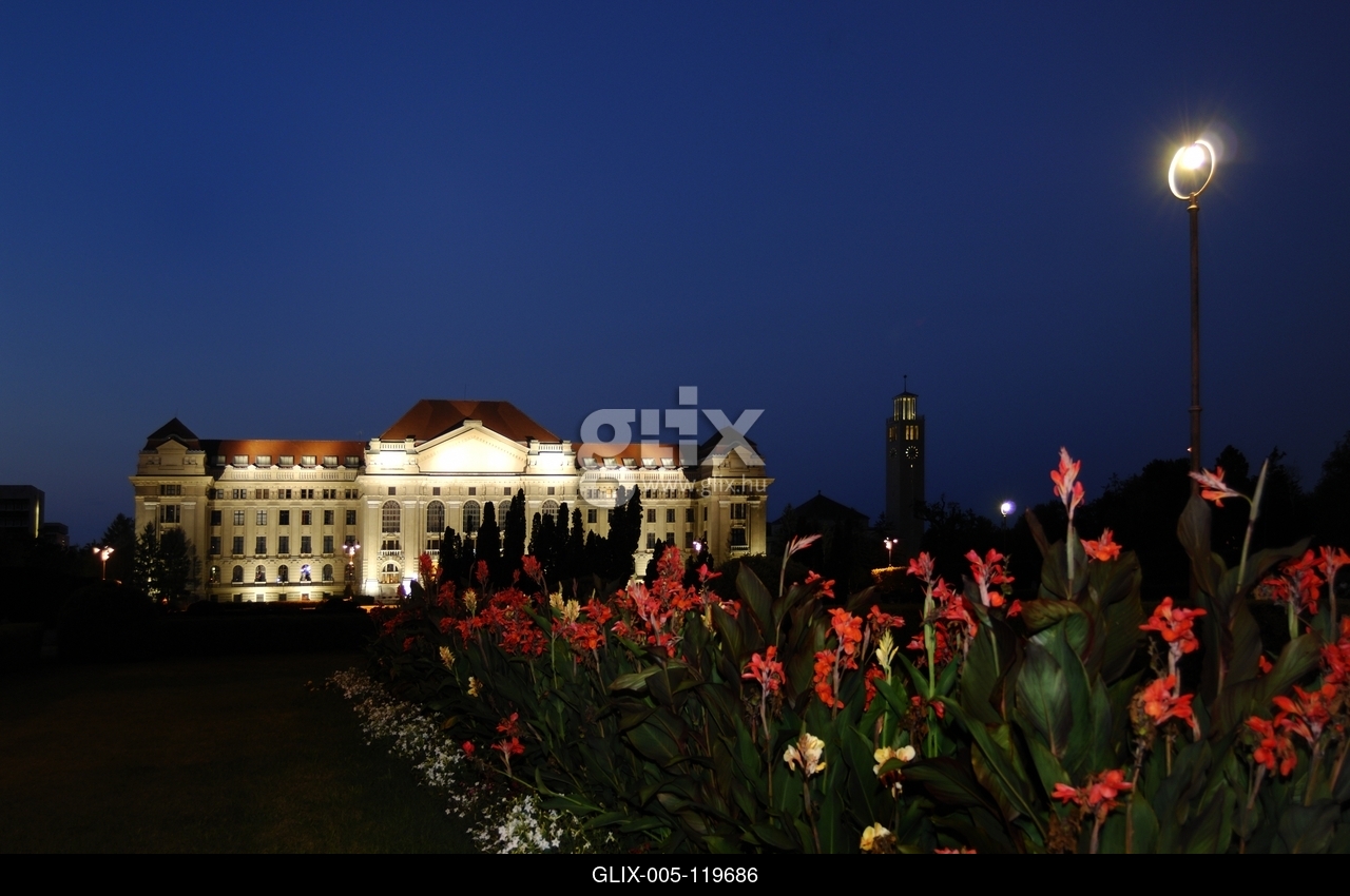 A Debreceni Egyetem főépülete esti díszkivilágításban.