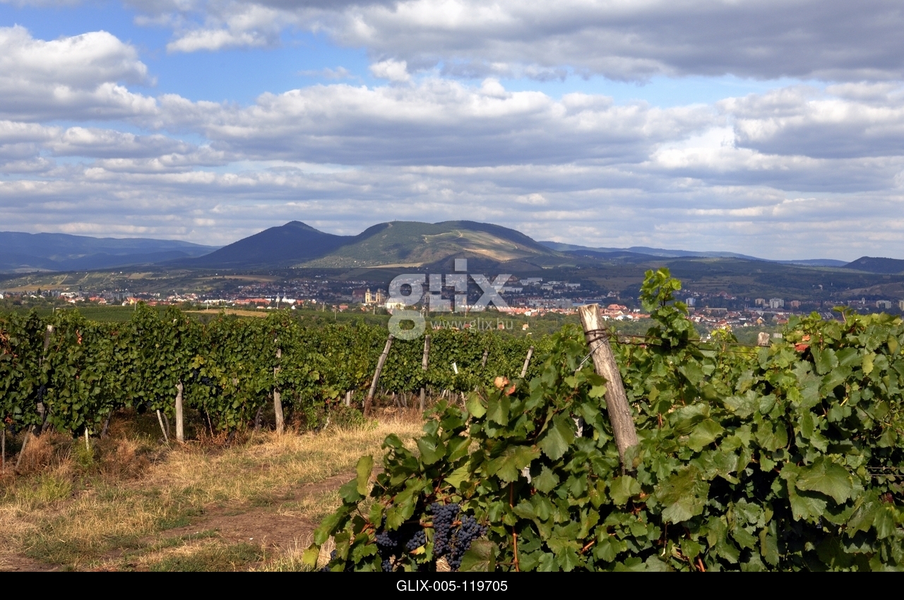 Szőlőültetvény Eger határában, háttérben a Bükk.