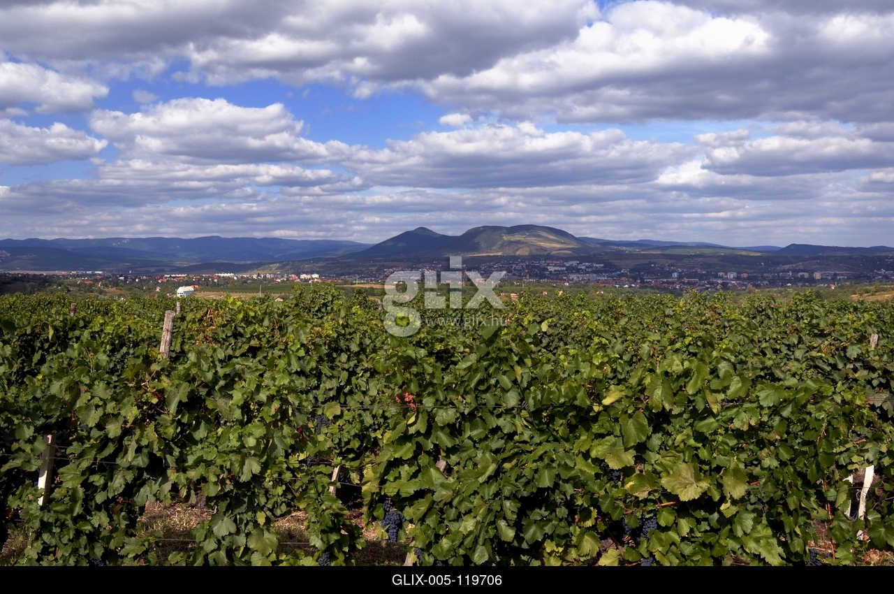 Szőlőültetvény Eger határában, háttérben a Bükk.