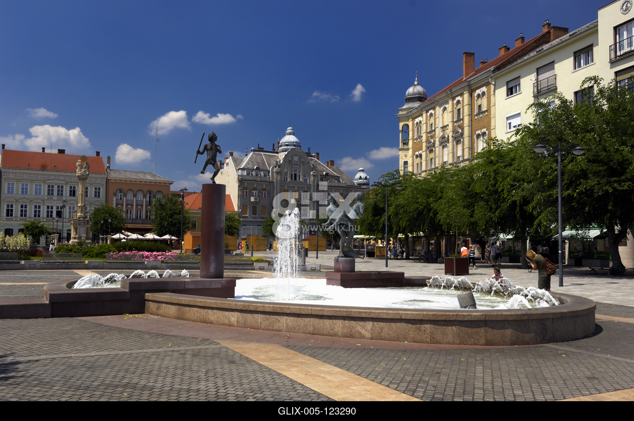 A város szökőkútja a Faunok szoborcsoporttal a barokk Fő téren.