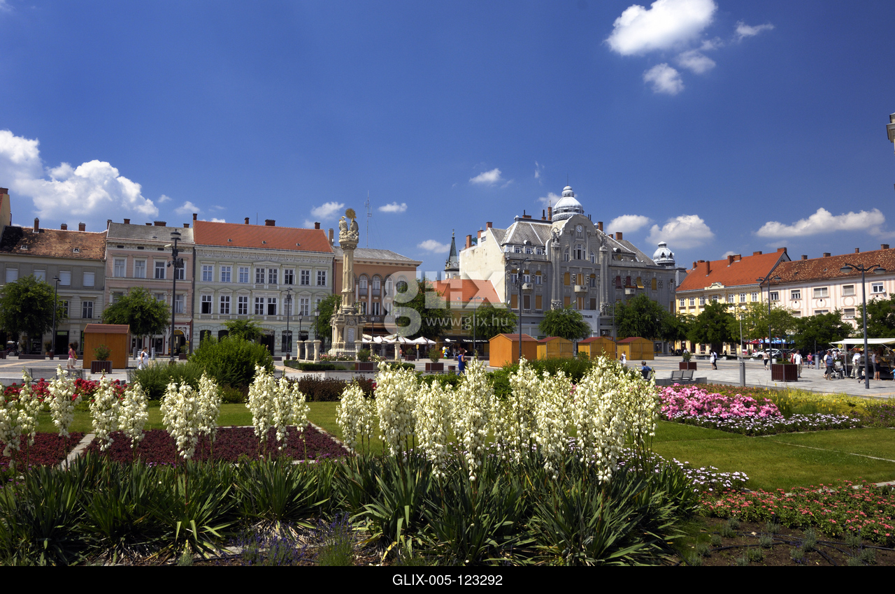 A Szentháromság-szobor a barokk Fő tér közepén.