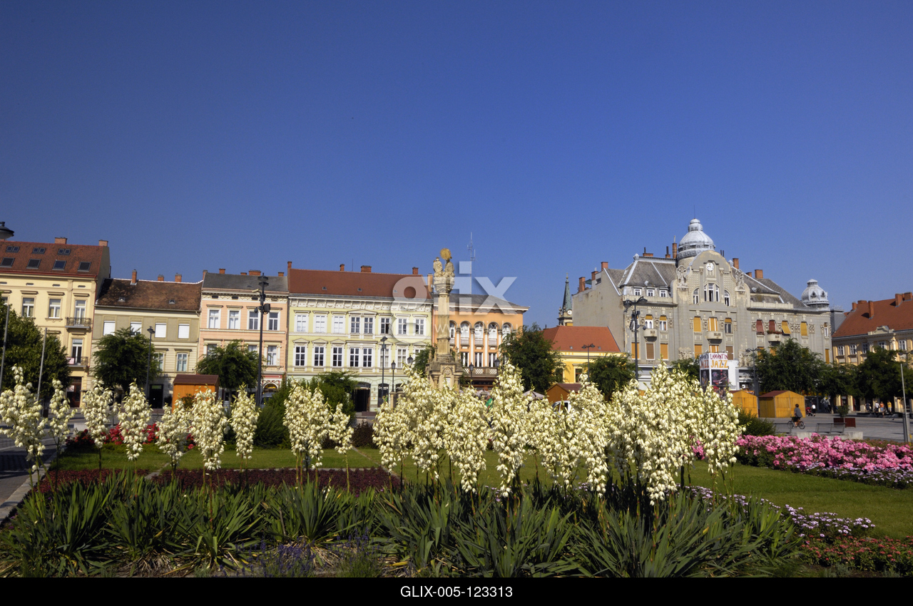A Szentháromság-szobor a barokk Fő tér közepén.