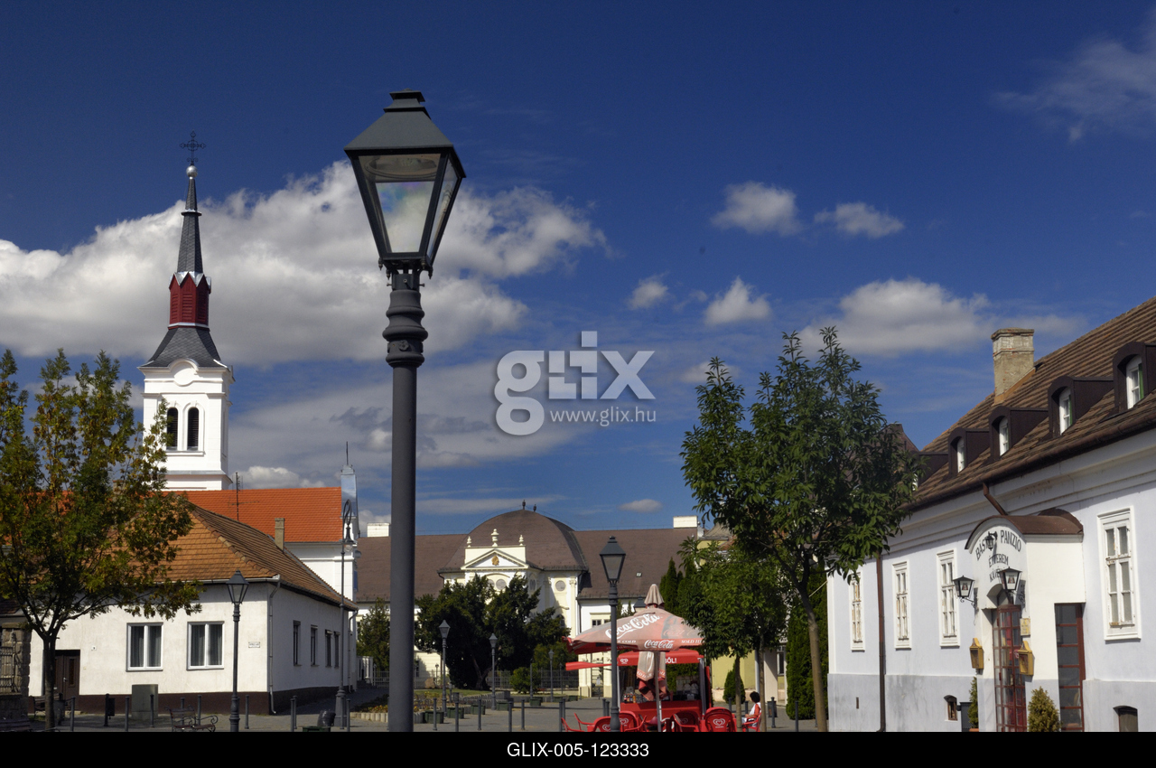 A történelmi belváros. Balra az evangélikus templom, szemben a Forgách-kastély barokk épülete.