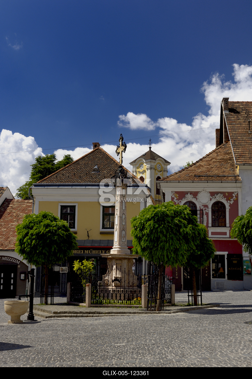 A műemlék barokk, illetve copf stílusú házakkal szegélyezett Fő tér. Középen a késő rokokó stílusú Kalmár-kereszt. Háttérben a vártemplom tornya.