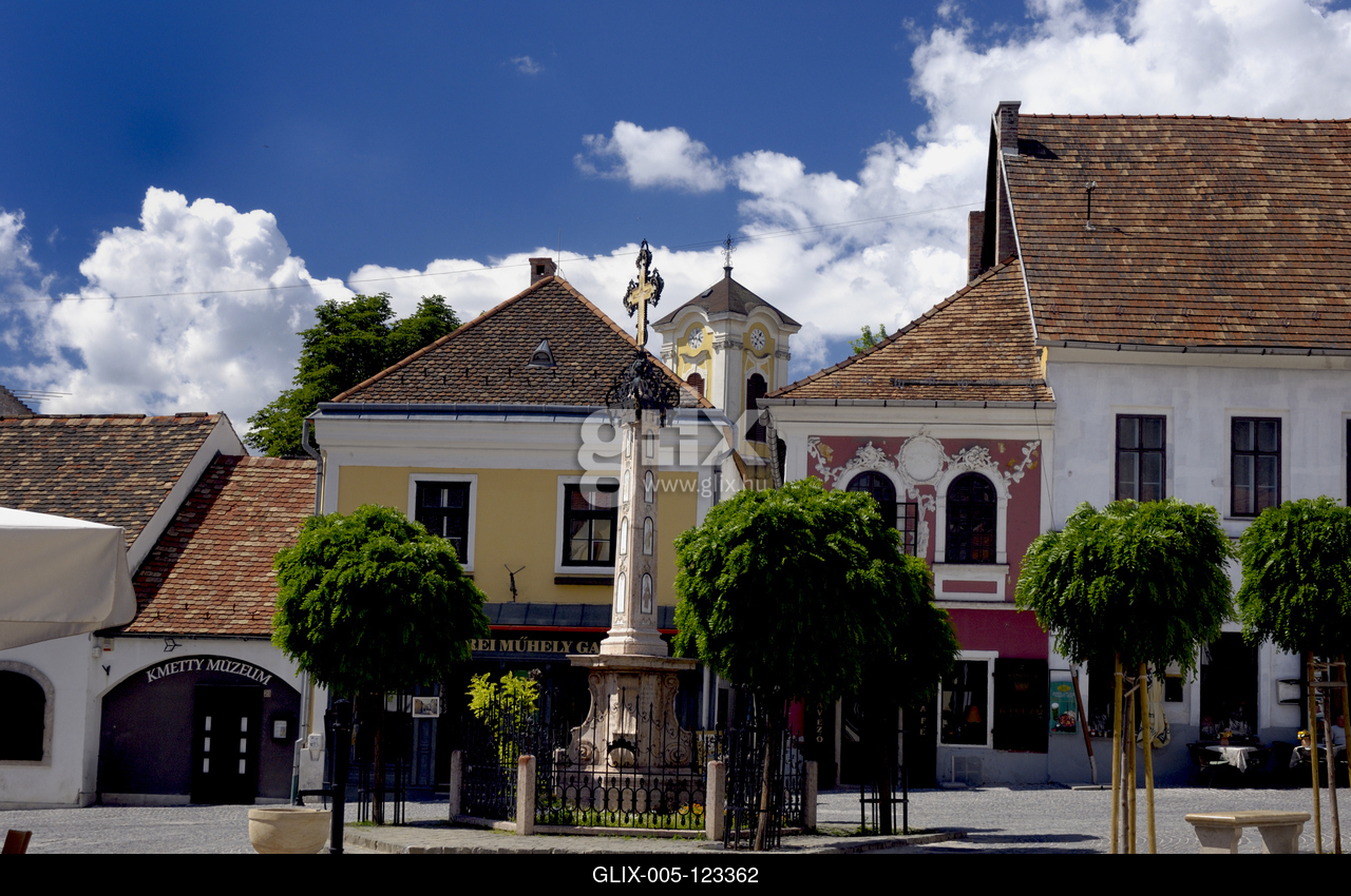 A műemlék barokk, illetve copf stílusú házakkal szegélyezett Fő tér. Középen a késő rokokó stílusú Kalmár-kereszt. Háttérben a vártemplom tornya.