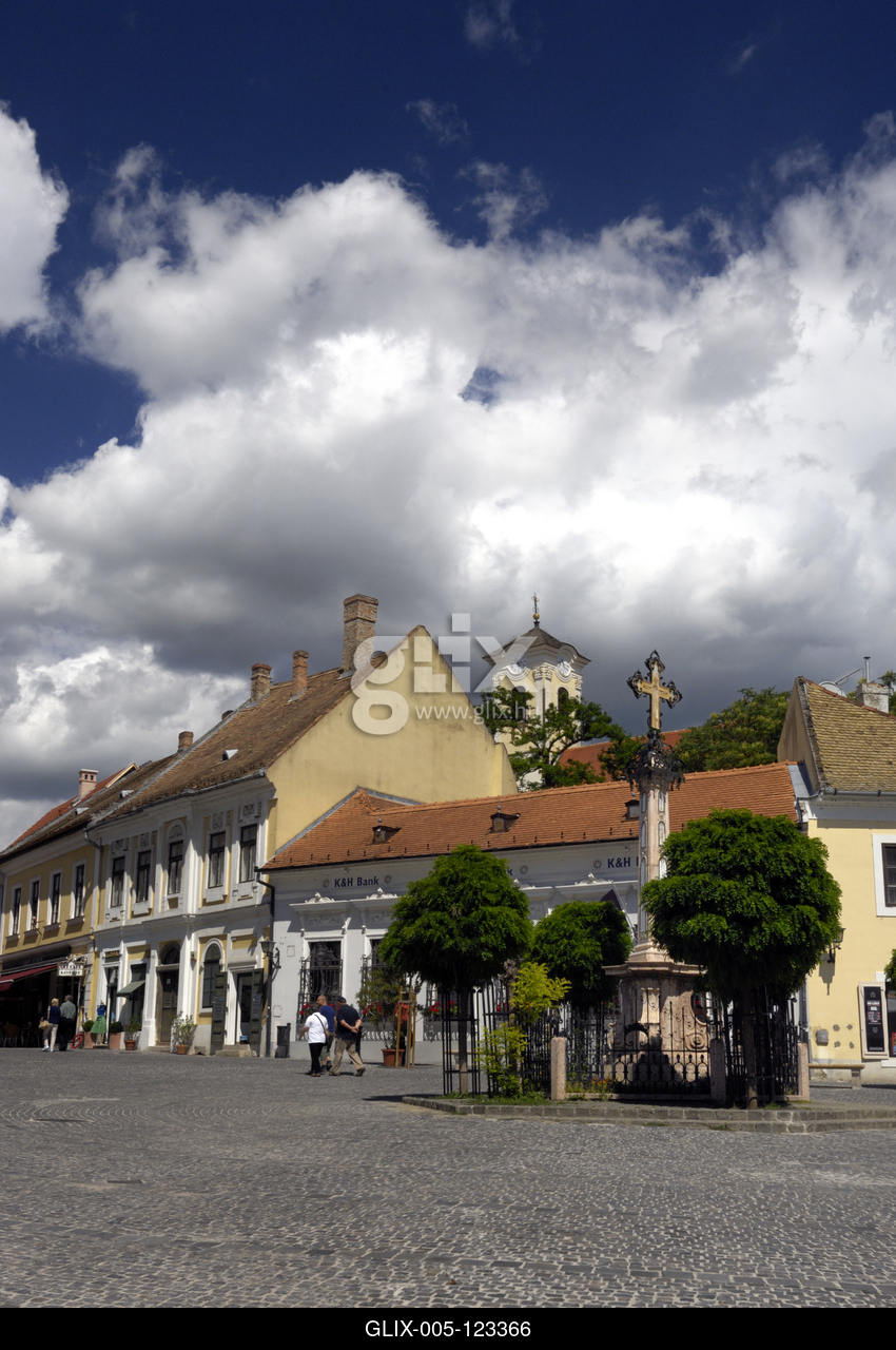 A műemlék barokk, illetve copf stílusú házakkal szegélyezett Fő tér. Középen a késő rokokó stílusú Kalmár-kereszt. Háttérben a vártemplom tornya.