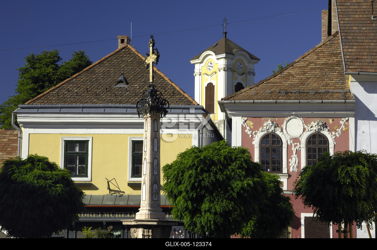 A műemlék barokk, illetve copf stílusú házakkal szegélyezett Fő tér. Középen a késő rokokó stílusú Kalmár-kereszt. Háttérben a vártemplom tornya.