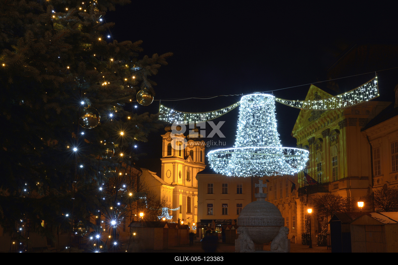 Karácsonyi díszkivilágítás a Városház téren. Középen az Országalma.