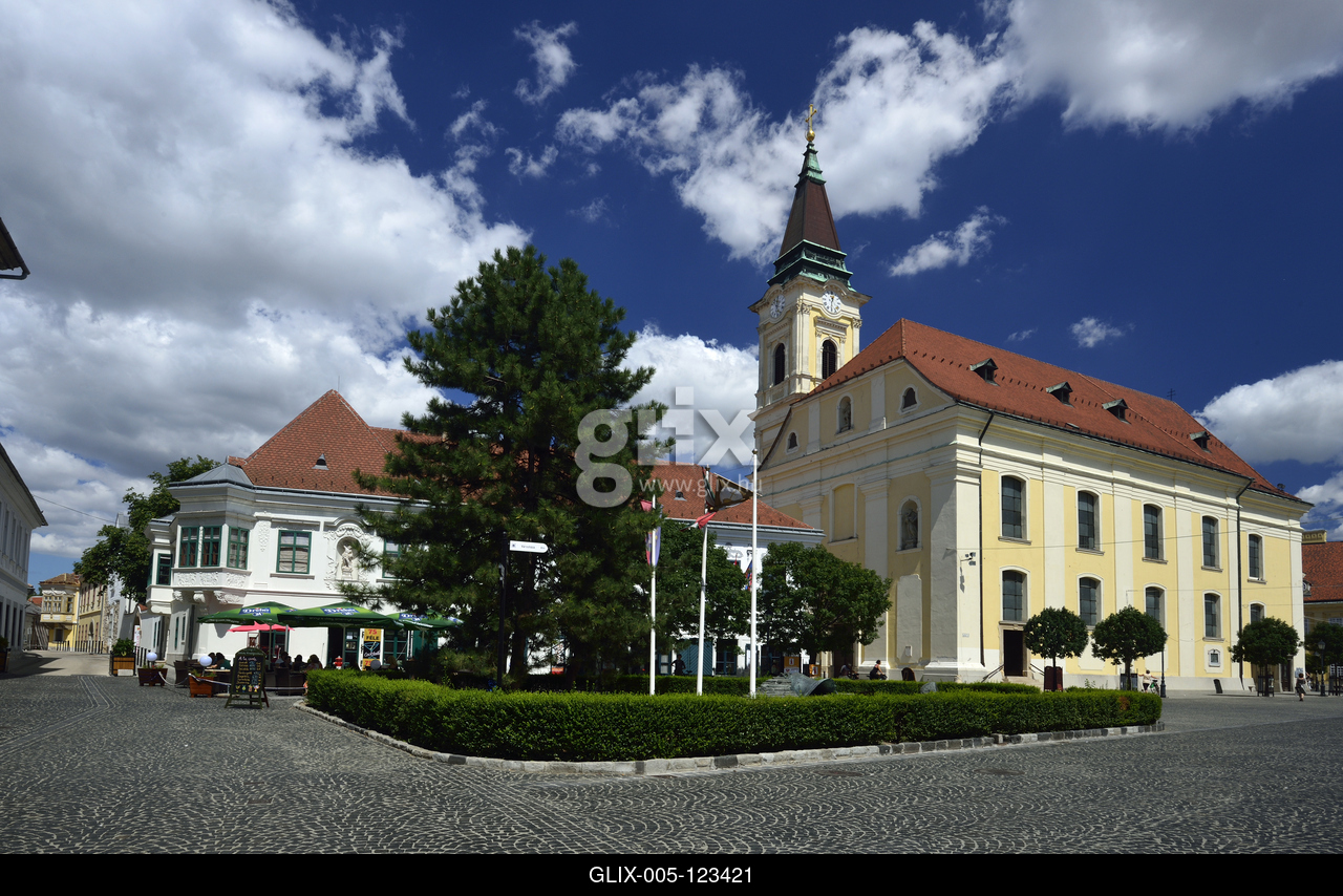 A barokk Szent Imre-templom a Városház téren. Balra a barokk-rokokó stílusú Hiemer-ház védett műemléki épületegyüttese.
