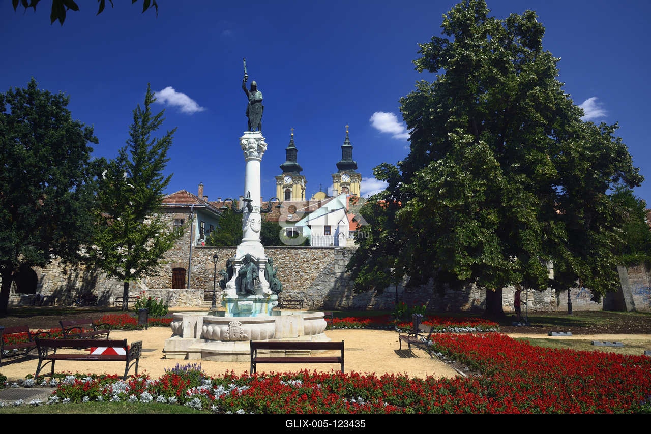 A várfal előtt kialakított téren Bory Jenő szobrászművész Püspökkútja áll, csúcsán egy kardot emelő vitézzel és a talapzaton négy püspök bronzszobrával.