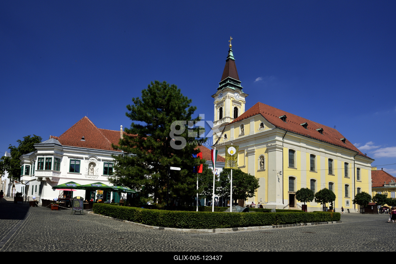 A barokk Szent Imre-templom a Városház téren. Balra a barokk-rokokó stílusú Hiemer-ház védett műemléki épületegyüttese.