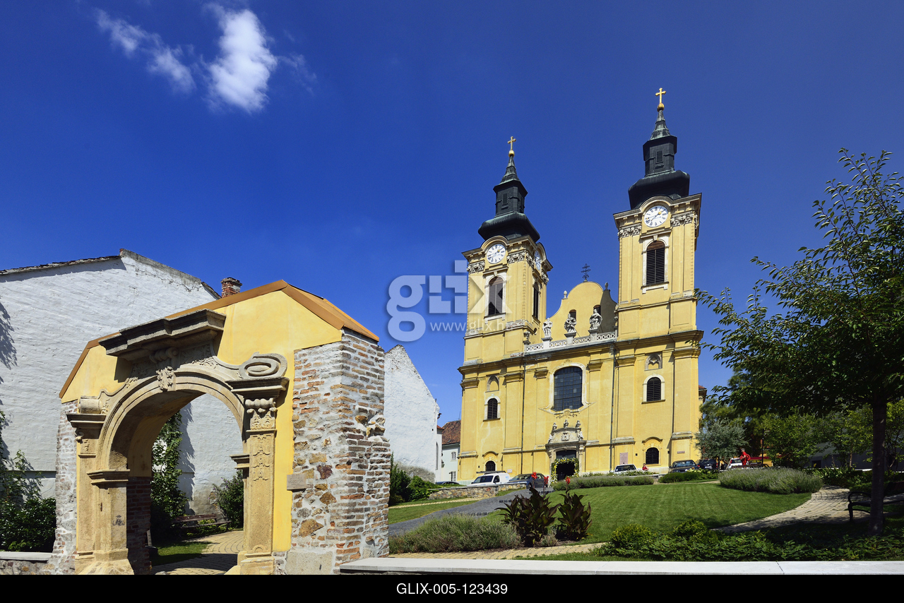 A Szent István-székesegyház erőteljes barokk, néhol gótikus elemeket viselő bazilika, Magyarország egyik legnagyobb katedrálisa. Előtérben az 1944-ben lebombázott kanonoki ház gótikus kapuja.