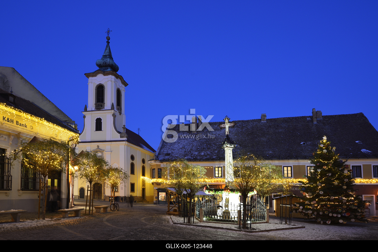 A műemlék barokk, illetve copf stílusú házakkal szegélyezett Fő tér. Középen a késő rokokó stílusú Kalmár-kereszt. Háttérben a barokk, rokokó Blagovesztenszka szerb görögkeleti templom.