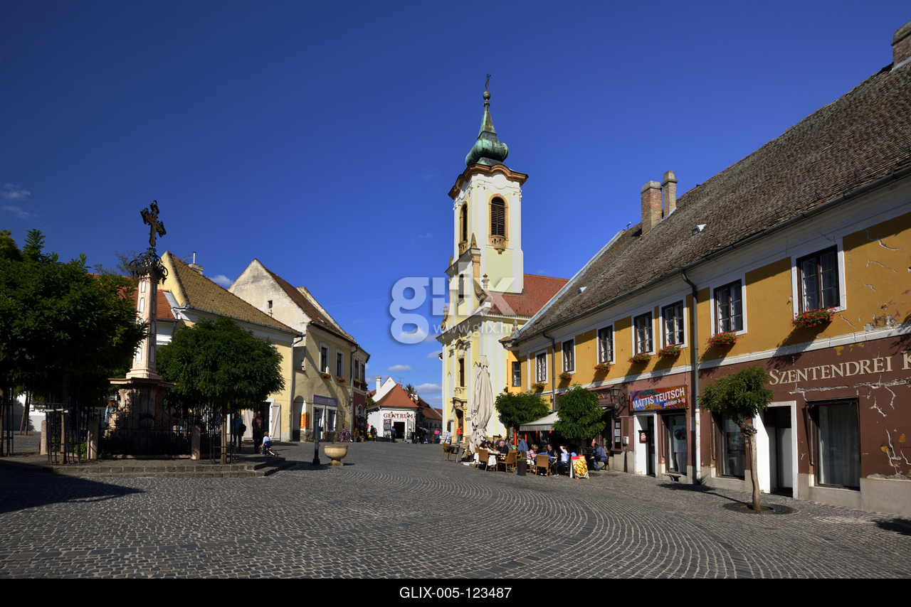 A műemlék barokk, illetve copf stílusú házakkal szegélyezett Fő tér. Középen a késő rokokó stílusú Kalmár-kereszt. Jobbra a barokk, rokokó Blagovesztenszka szerb görögkeleti templom.