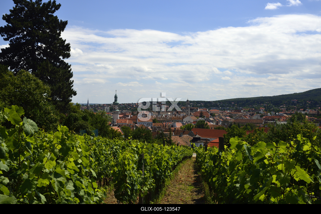 Soproni szőlőtőkék a Koronázódombon. Háttérben a belváros.