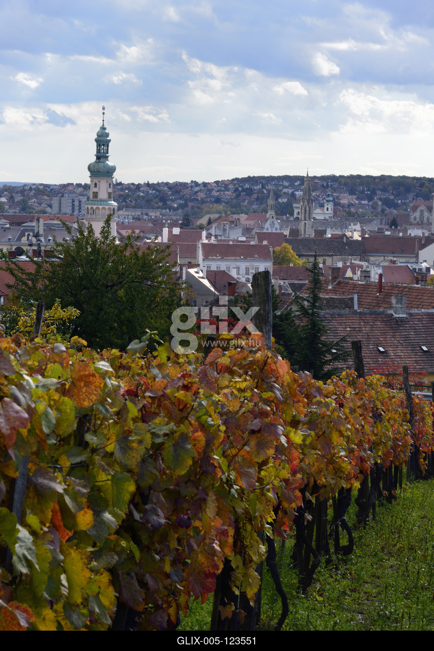 Soproni szőlőtőkék a Koronázódombon. Háttérben a belváros.