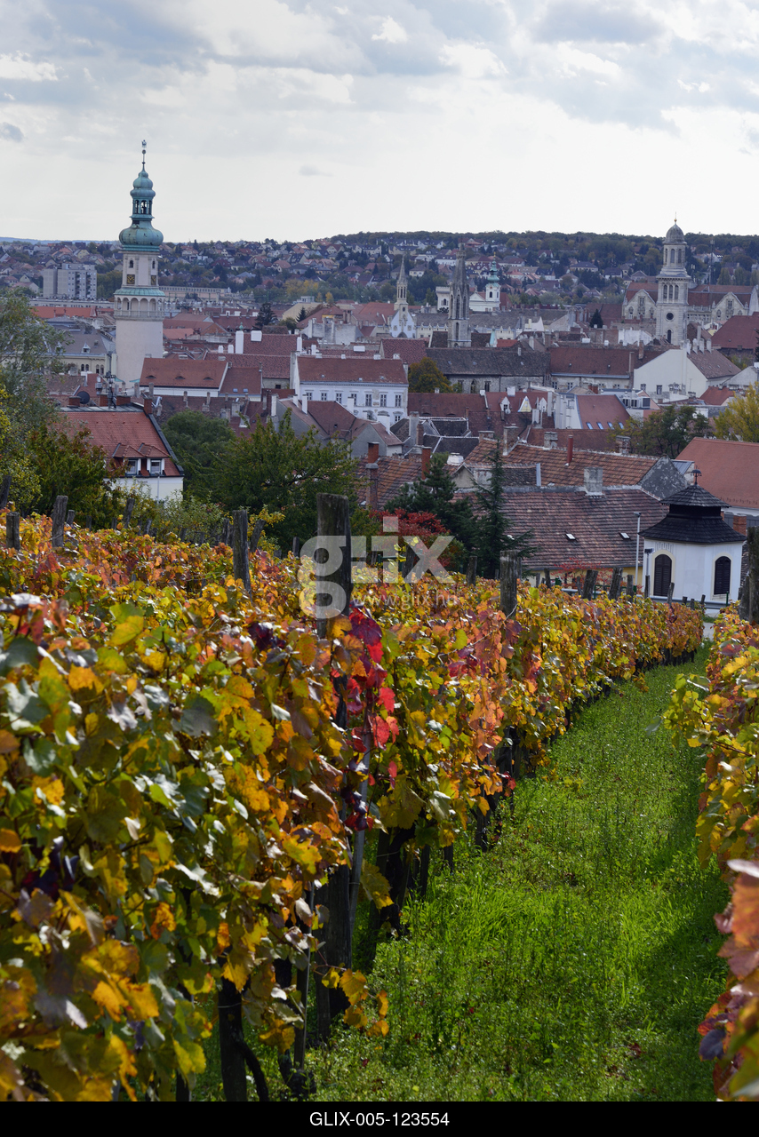 Soproni szőlőtőkék a Koronázódombon. Háttérben a belváros.