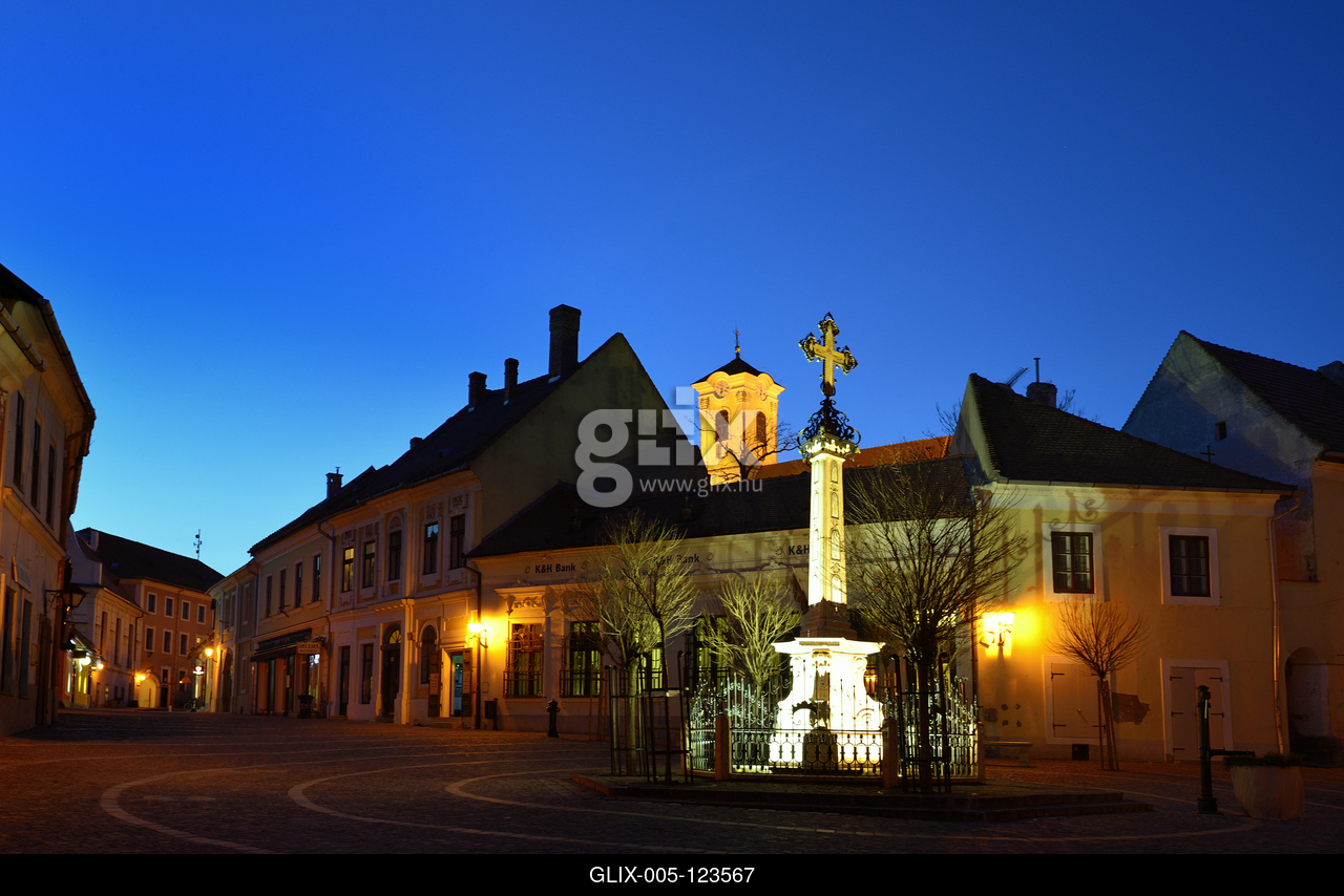 A műemlék barokk, illetve copf stílusú házakkal szegélyezett Fő tér. Középen a késő rokokó stílusú Kalmár-kereszt. Háttérben a vártemplom tornya.