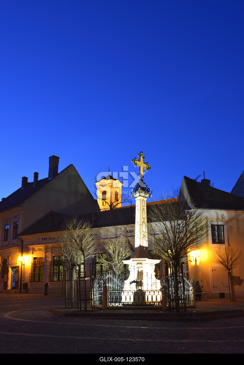 A műemlék barokk, illetve copf stílusú házakkal szegélyezett Fő tér. Középen a késő rokokó stílusú Kalmár-kereszt. Háttérben a vártemplom tornya.