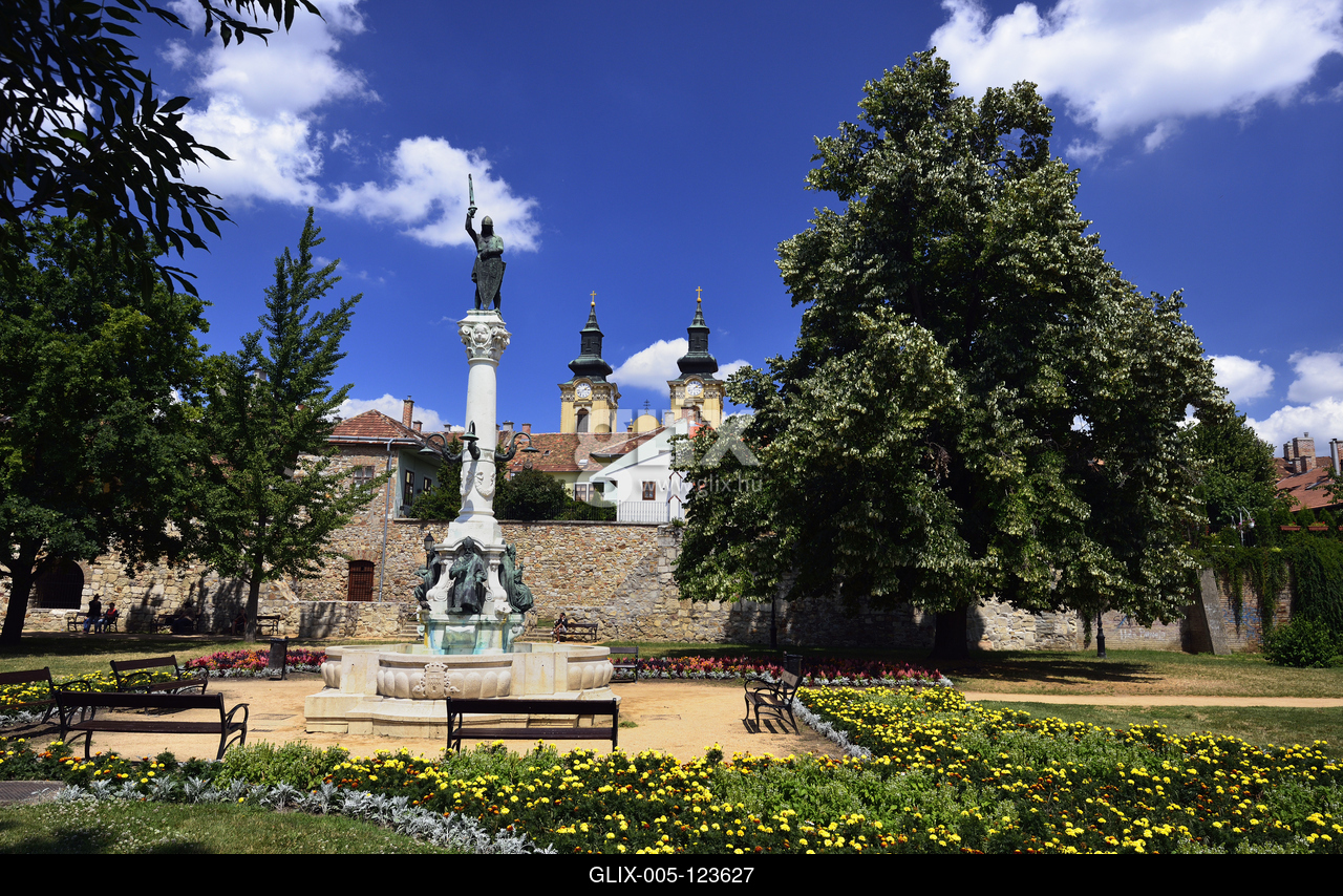 A várfal előtt kialakított téren Bory Jenő szobrászművész Püspökkútja áll, csúcsán egy kardot emelő vitézzel és a talapzaton négy püspök bronzszobrával.