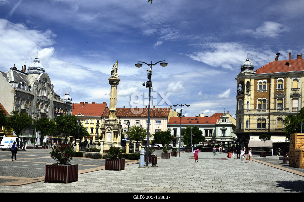 A barokk Fő tér. Középen a Szentháromság-szobor, balra a szecessziós stílusú Centrum Áruház épülete, jobbra az eklektikus stílusban, sarokerkéllyel épült bérpalota.